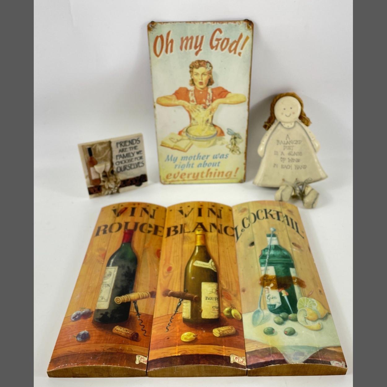 MIXED LOT OF KITCHEN WALL HANGING CURIOS to include two comical curios, a wooden doll with the message 'A Balanced Diet is a glass of wine in each hand' 20cm length approx and 'Friends are the family we choose for ourselves' 9.5cm square and lastly a small tin hanging sign 'Oh My God! My Mother Was Right About Everything!' 14cm x 24.5cm approx and lastly 3 wall hanging wooden wine bottle signs 24.5cm x 10cm etc