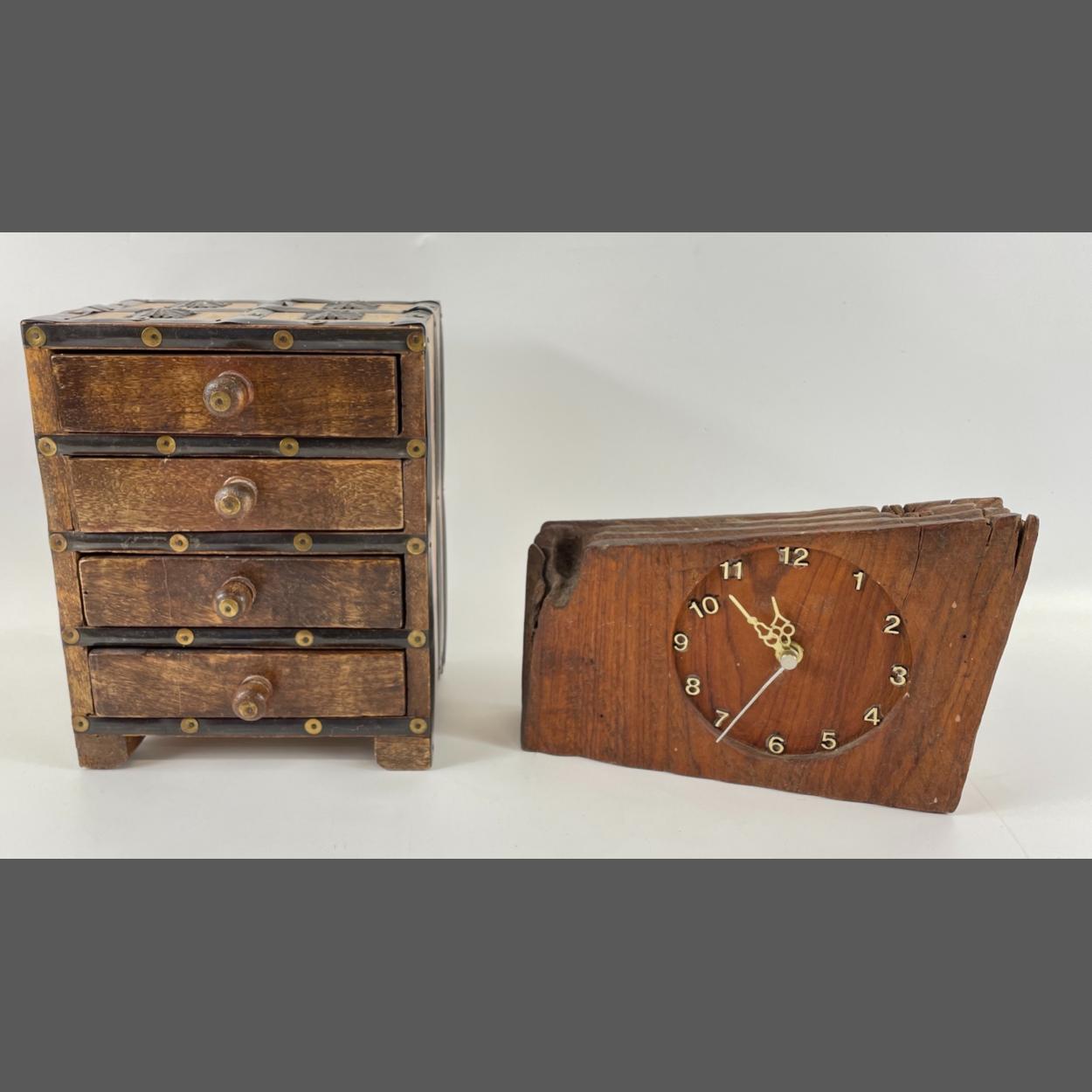A solid wooden battery-run mantle clock dimensions 19.5cm x 14cm approx and also a wee set of four drawers suitable for dressing table jewellery etc dimensions 21cm high x 12cm depth x 16.5cm width approx.