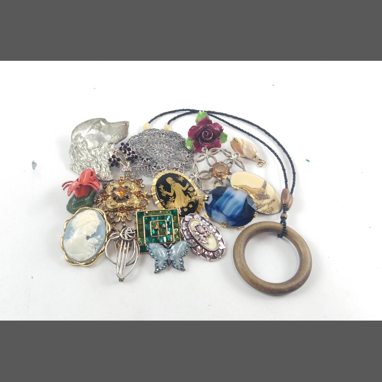 A box containing a quantity of costume jewellery to include brooches and pendants etc