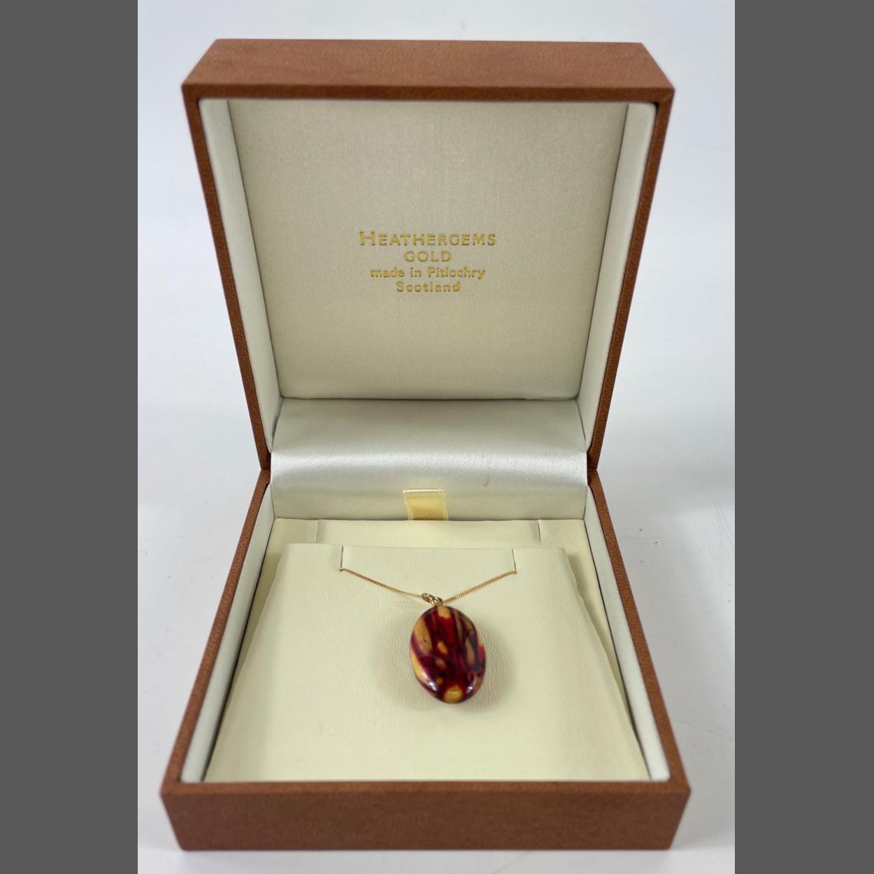 A boxed heathergems pendant on a 375 marked fine yellow gold chain, length 40cm, gross weight 2.54gms