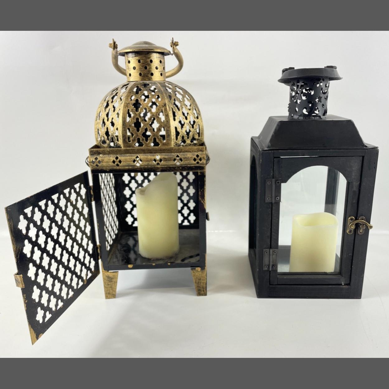 Two MODERN DECORATIVE Lanterns, one in black with glass windows height 35cm x 16cm square approx and also another larger gold painted metal pierced lantern 50cm tall x 16cm square approx - both lanterns designed to burn church candles.