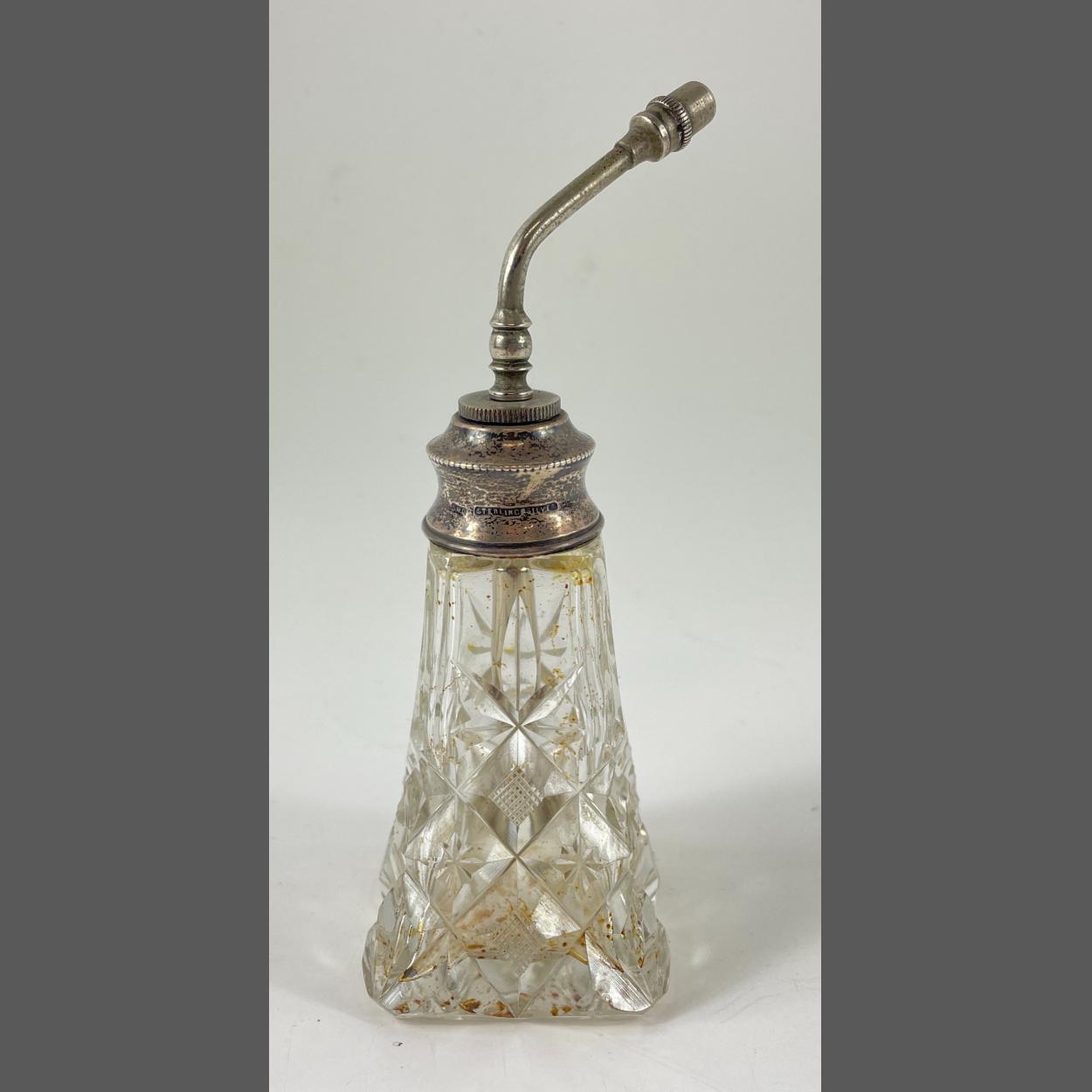 A cut-glass scent atomiser with a sterling silver top and sprayer 9x 4.5cm