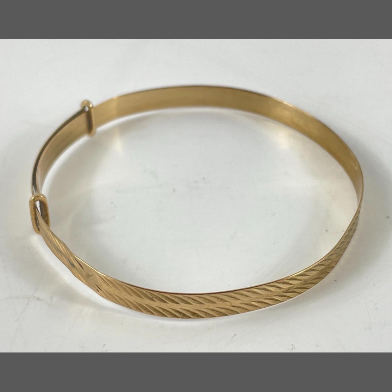 A 375 marked yellow gold child's engraved bangle, gross weight 3.45gms