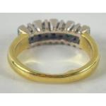 A 750 stamped yellow gold diamond and emerald set ring with 5 baguette cut emeralds with 4 sets of 2 diamond spacers, size J, gross weight 4.90gms (centre emerald chipped and one other broken)