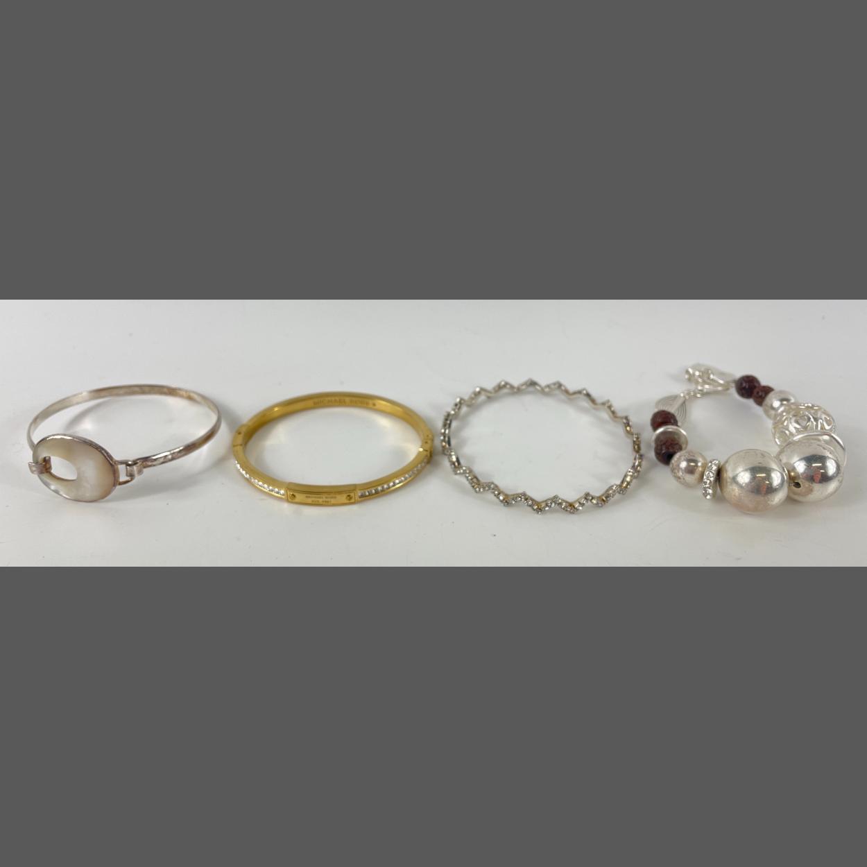 Four fashion jewellery bangles to include a yellow metal MICHAEL KORS set with clear stones, a zigzag bangle, a pilgrim bracelet and a 925 bangle, gross weight 12.40gms