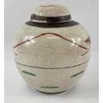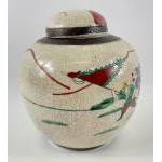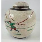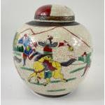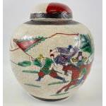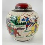 An old Chinese crackle glaze ginger jar with a design of fighting warriors, signed to base standing approx 20cm tall
