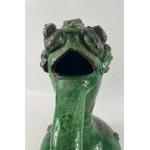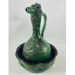 A large dark green TORQUAY pottery ewer and bowl, ewer stands 40cm high and the bowl is 28cm dia, there is some damage to the ewer and a chip from the lip of the bowl but as decorative items they remain impressive.