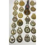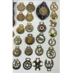 A box of 41 HORSE BRASSES to include 2 mounted on leather, one inscribed " George V crowned 1911, Long live the king", and one inscribed "1887 VR"