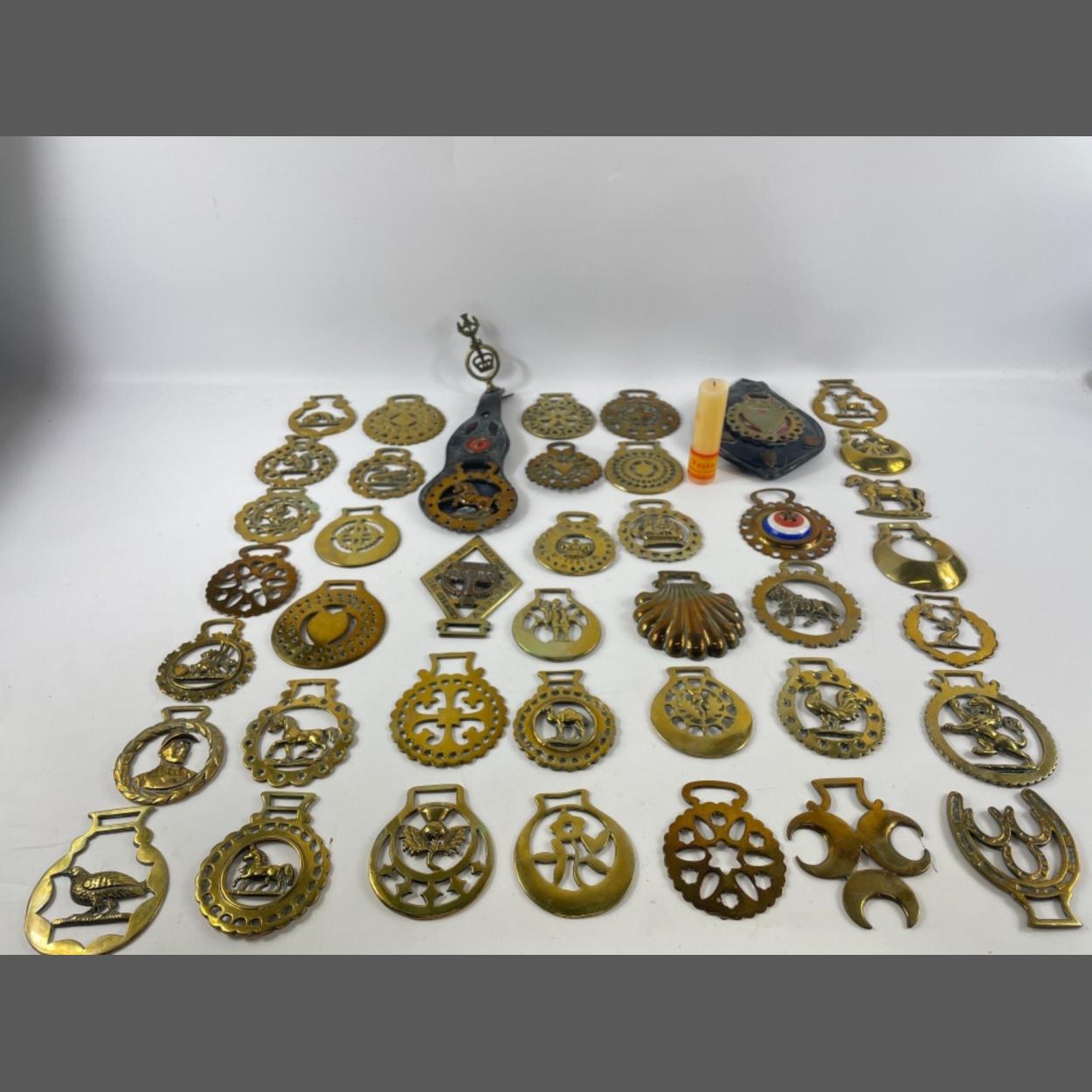 A box of 41 HORSE BRASSES to include 2 mounted on leather, one inscribed " George V crowned 1911, Long live the king", and one inscribed "1887 VR"