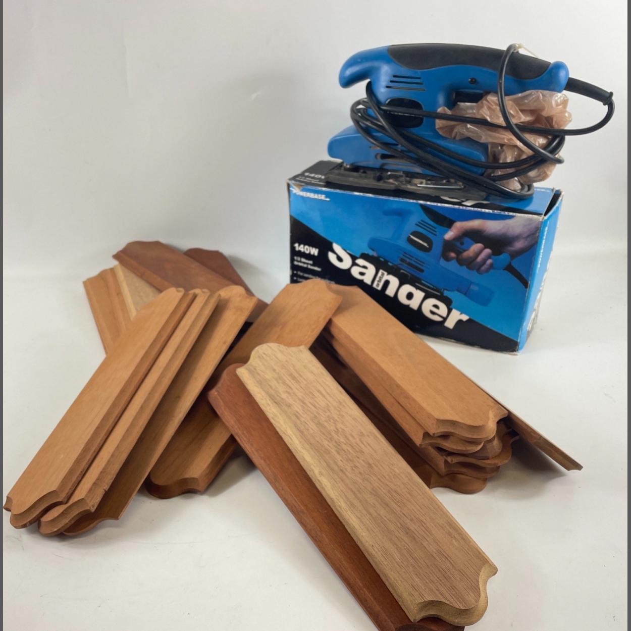Vintage set of 22 hand made matching Mahogany door finger plates – never used with a working boxed Powerbase Orbital Sander (with instructions)