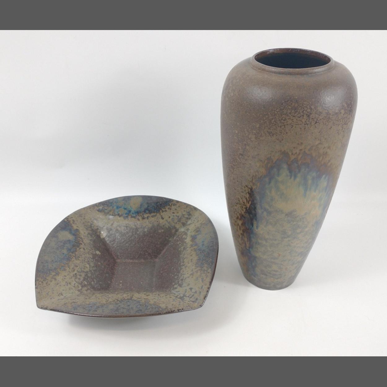 Two pieces of TONY LAVERICK ASL Studio Pottery - a vase approx 30cm high and a dish with a 6cm square base and width of 24cm
