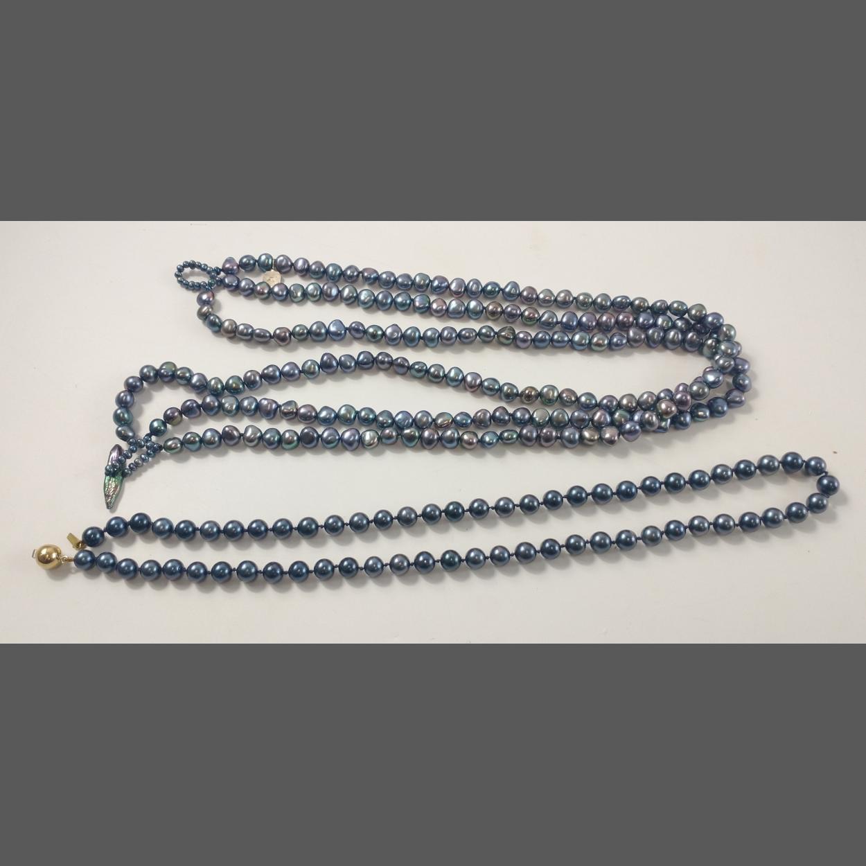 20" single strand of coloured blues/purple pearls with a 375 stamped clasp - reputedly purchased from a top Edinburgh Jewellers! retail from jewellers shop both sets new £1500