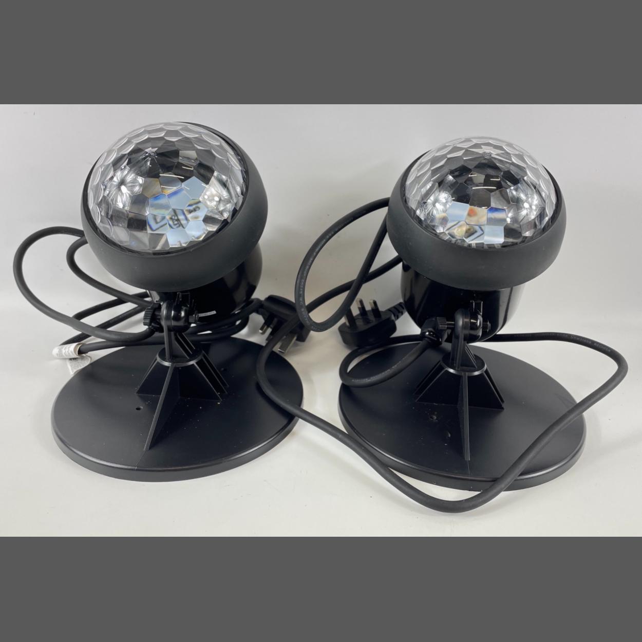A pair of outdoor ION HOLIDAY PARTY PLUS lights and fittings which is "a self-contained unit that projects beautiful, bright Red, Blue, Green, Purple, Orange and White lights onto your house", remote control and instruction booklet included