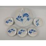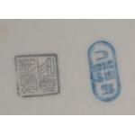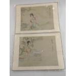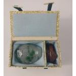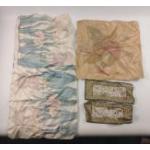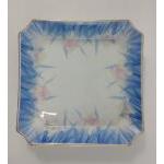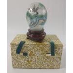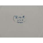 ORIENTAL china to include a large platter (31cm dia) by ONO Japan with a design of 2 cranes and 5 matching plates (15cm dia), an ornate plate with a bird pattern highlighted in gold (32cm width), a wooden box (10cm L) with an inlaid pattern on lid, a hollow glass egg with design of cranes 7cm long with stand and a padded presentation box, a square plate edged with gilt and design of lilies and blue leaves 15x15cm, a pair of Thai silk cushion covers plus 1 other and 2 silk paintings of ladies in kimonos (38x27cm)