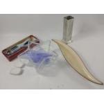 A mixed lot to include a STUDIO POTTERY plate (29cm dia) and jampot with lid, a DENBY twin-handled lidded soupbowl, 2 chopstick rests, a HORNSEA CONCEPT oil and vinegar combination, a CHARLES RENNIE MACKINTOSH pewter vase (15cm tall), a 35cm long leaf-shaped dish, a pair of brass Indian vases (30cm tall), a pair of 'No 1' vases (23cm tall) with some chips, a star-shaped glass dish (18x7cm), a boxed set of REYROLLE crackerjack nutcrackers