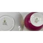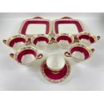 Imagine warm mince pies in front of a roaring fire using this ruby-coloured china - a WEDGWOOD WHITEHALL powder ruby tea service and part dinner sevice to include 6 cups, 6 saucers (15cm), 6 plates (15cm), 2 square cake plates (24x24cm), a milk jug, a sugar bowl (stamped Coronation Year 1954-1954 to base), 6 twin-handled soupbowls with underplates (16cm dia), 6 plates (23cm), 6 plates (27cm) (2 with very light scratch mark)