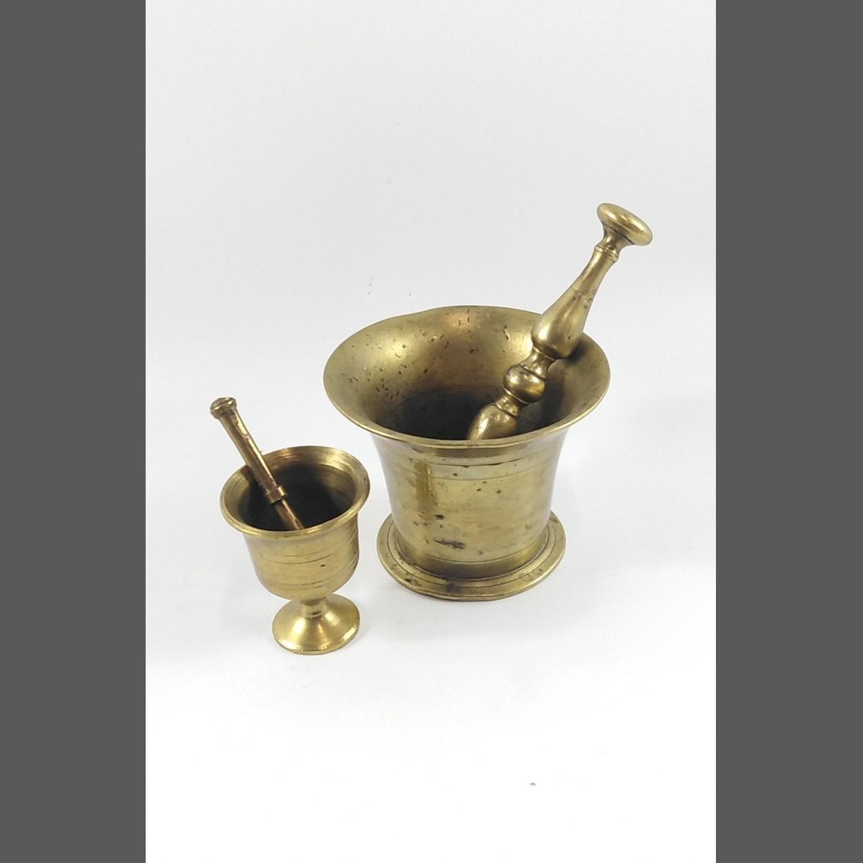 Two brass mortar and pestles one 9.5cm tall and 12cm diameter, the other 7.5cm tall and 6cm diameter