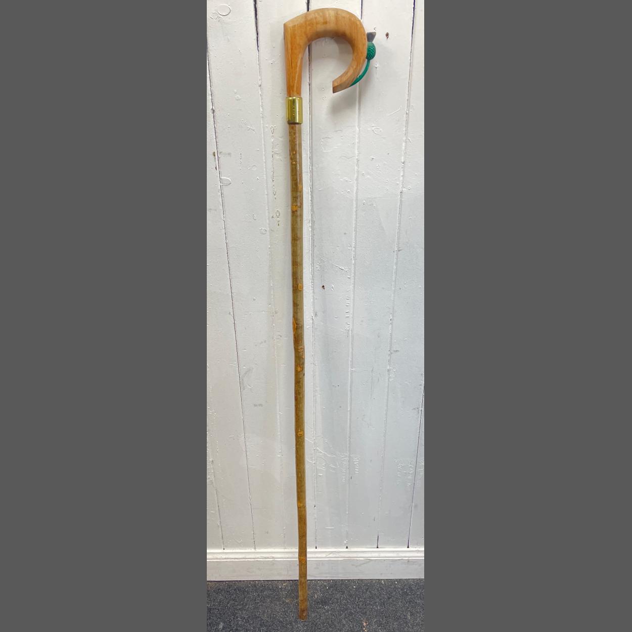 A HANDMADE in the Scottish Borders a sheherd's CROOK style walking stick with a feature THISTLE emblem and brass fitting - 4ft in height approx