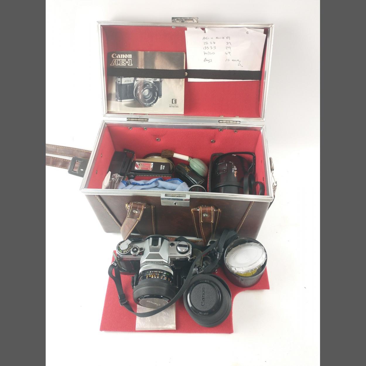 A CANON AE-1 35mm film camera with a CANON FD 50mm 1:18 S.C lens(attached to the camera) and also a CANON Lens FD 28mm 1:2.8, a further CANON ZOOM LENS FD 70-210mm1:4 , and yet another lens a CANON FD 135mm 1:35 S.C with stout camera accessory carry-case 4