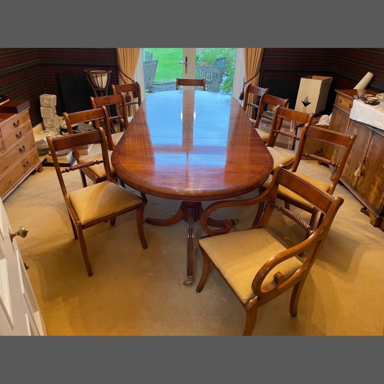 A large SUPER QUALITY extending YEW WOOD oval dining table with extension leaves and additional support legs when extended - 16ft approx including two carvers and eight dining chairs - the dining table is in lovely condition as are the chairs.