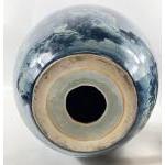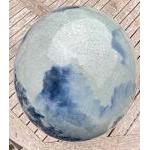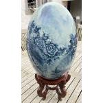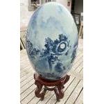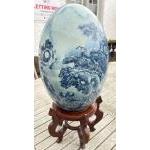 A SUBSTANTIAL ceramic blue and white egg with flora and fauna decoration on an oriental style wooden stand - this is a very large statement and decorative piece - dimensions 40cm tall x 28cm width approx at the widest point, the height including the stand 60cm approx