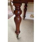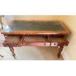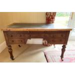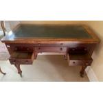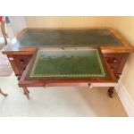 PURCHASED FROM GEORGIAN ANTIQUES - An early VICTORIAN LARGE KNEEHOLE mahogany desk with central green leather writing pad with gold leaf design, with central pull-out writing pad on green leather with gold leaf edged design - with five drawers on turned legs on original brass castors - dimensions desk top 130cm x 70cm x 78cm height