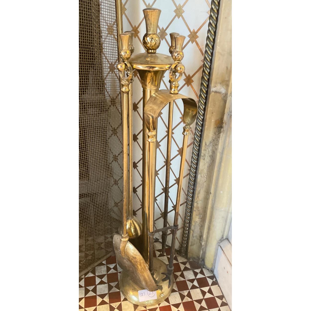 A large antique style BRASS COMPANION set height 55cm to include coal tongs, shovel, brush and poker