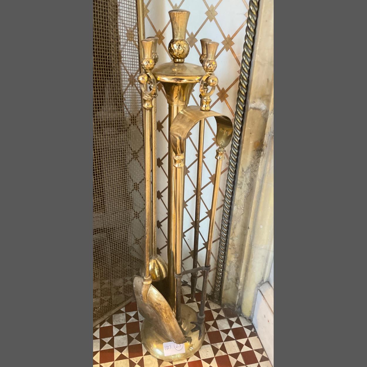 A large antique style BRASS COMPANION set height 55cm to include coal tongs, shovel, brush and poker