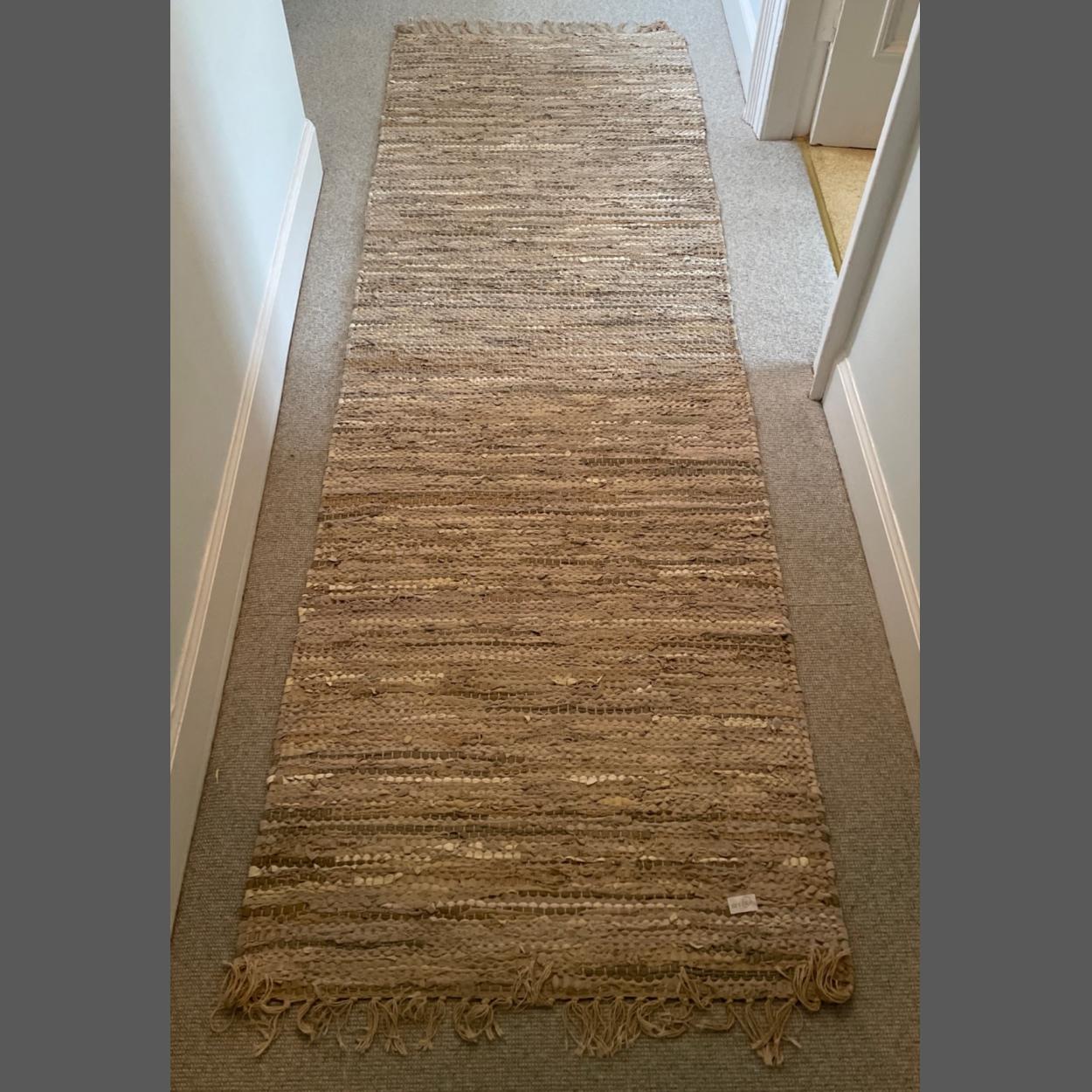 A BROSTE OF COPENHAGEN made leather and fabric based runner rug in creams and beiges and some brown -Dimensions 8ft long x 2.5ft wide approx
