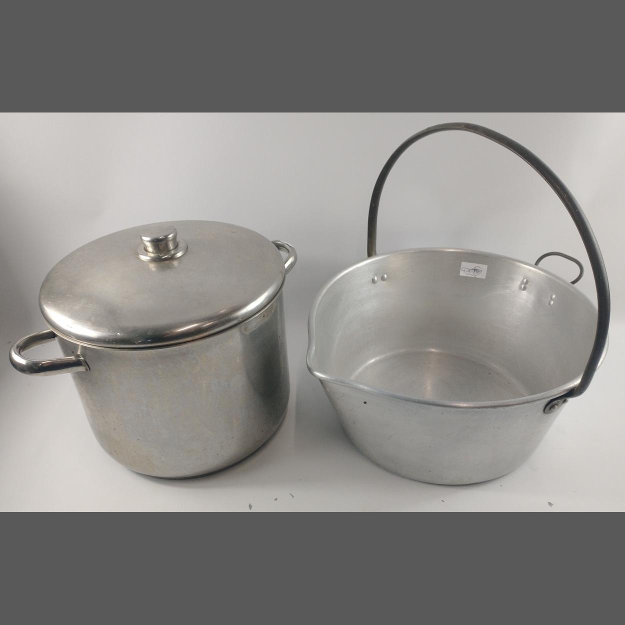 A large HORWOOD 83 STOCK POT (23cm high) and an aluminium jelly pan (38cm diameter)