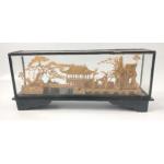 A Chinese cork tableau in a glass case with a scene of a pagoda, trees and bridges etc, case measures 23x10x5cm approx