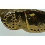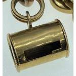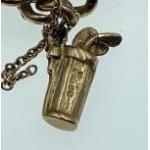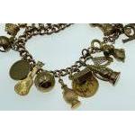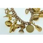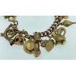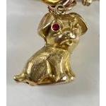 A 375 stamped gold charm bracelet , the 375 is partially rubbed, with most charms stamped 375, the remainder has been magnet tested - combined gross weight of 64.55g as one of the charms (dog) has a tiny garnet for an eye( the other missing)