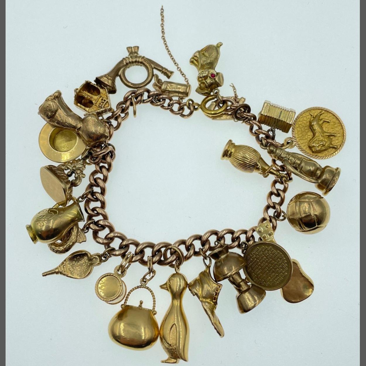 A 375 stamped gold charm bracelet , the 375 is partially rubbed, with most charms stamped 375, the remainder has been magnet tested - combined gross weight of 64.55g as one of the charms (dog) has a tiny garnet for an eye( the other missing)