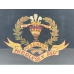 Two WWl medals awarded to Pte EH Field of the Middlesex Regiment to include the VICTORY MEDAL and the WAR MEDAL 1914-19 in original postage box with paperwork plus a MIDDLESEX REGIMENT needlework badge (38x31cm)