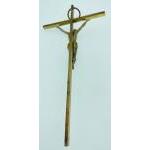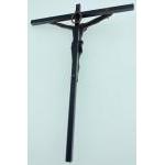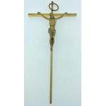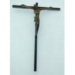 Two vintage French bronze crucifixes - the larger darker bronze 16cm height x 12cm width approx, the smaller one 16cm tall x 8cm width approx