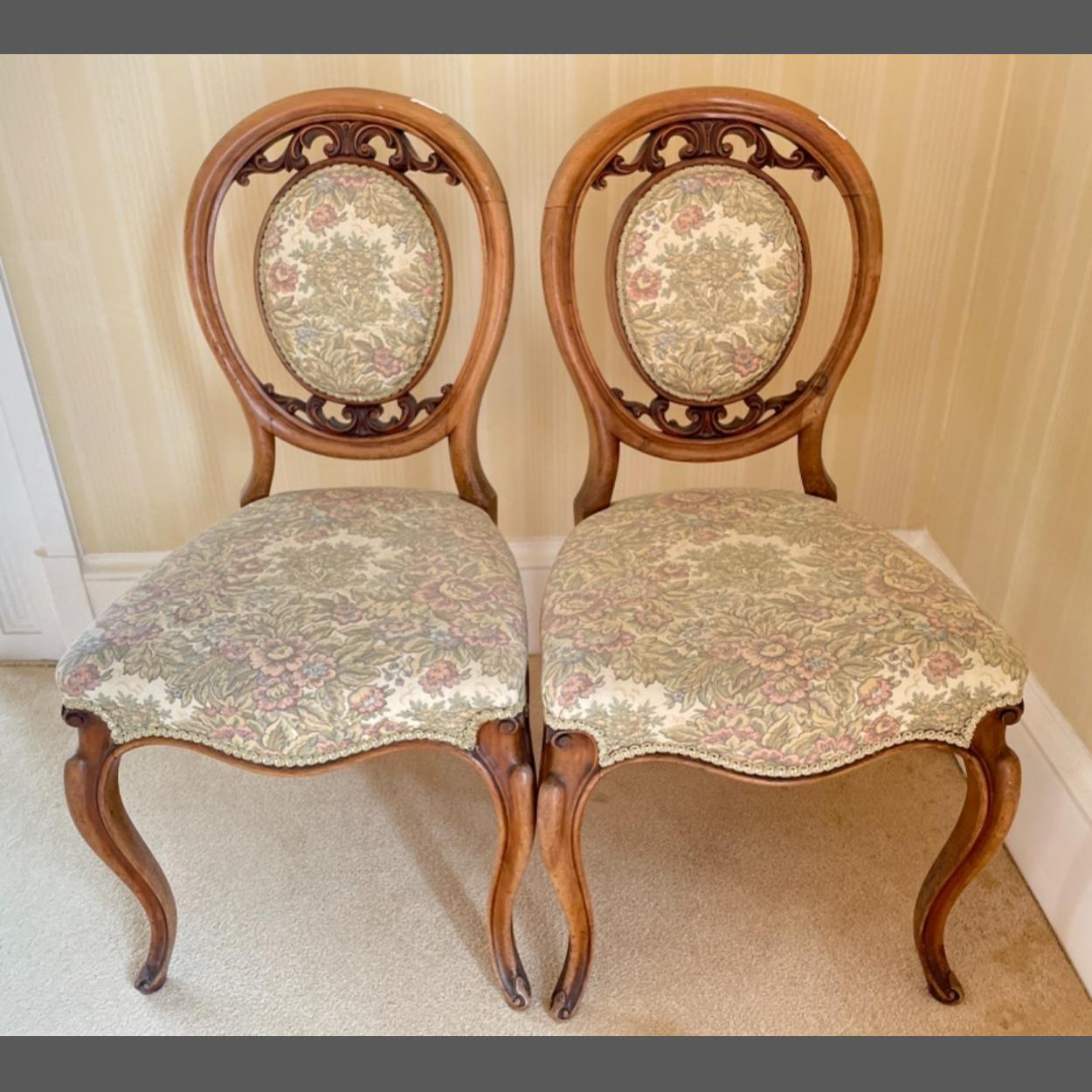 PURCHASED FROM GEORGIAN ANTIQUES IN EDINBURGH - A pair of VICTORIAN light ash wood formal chairs- with fabric seat covers and back pad, with beautiful carved wood design on the back of each chair - dimension 88cm height from floor to the top of the chair