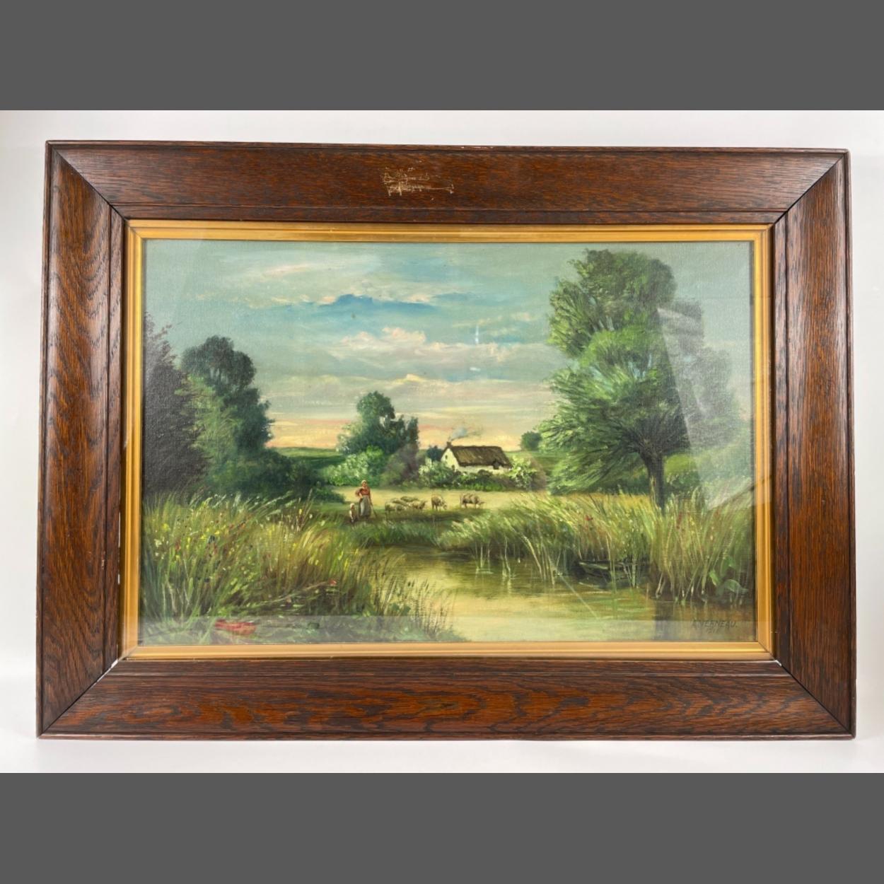 Framed ORIGINAL oil on canvas farm scene signed A Vernaeau 1916 ( Belgian Artist) frame dimensions 30" x 22"