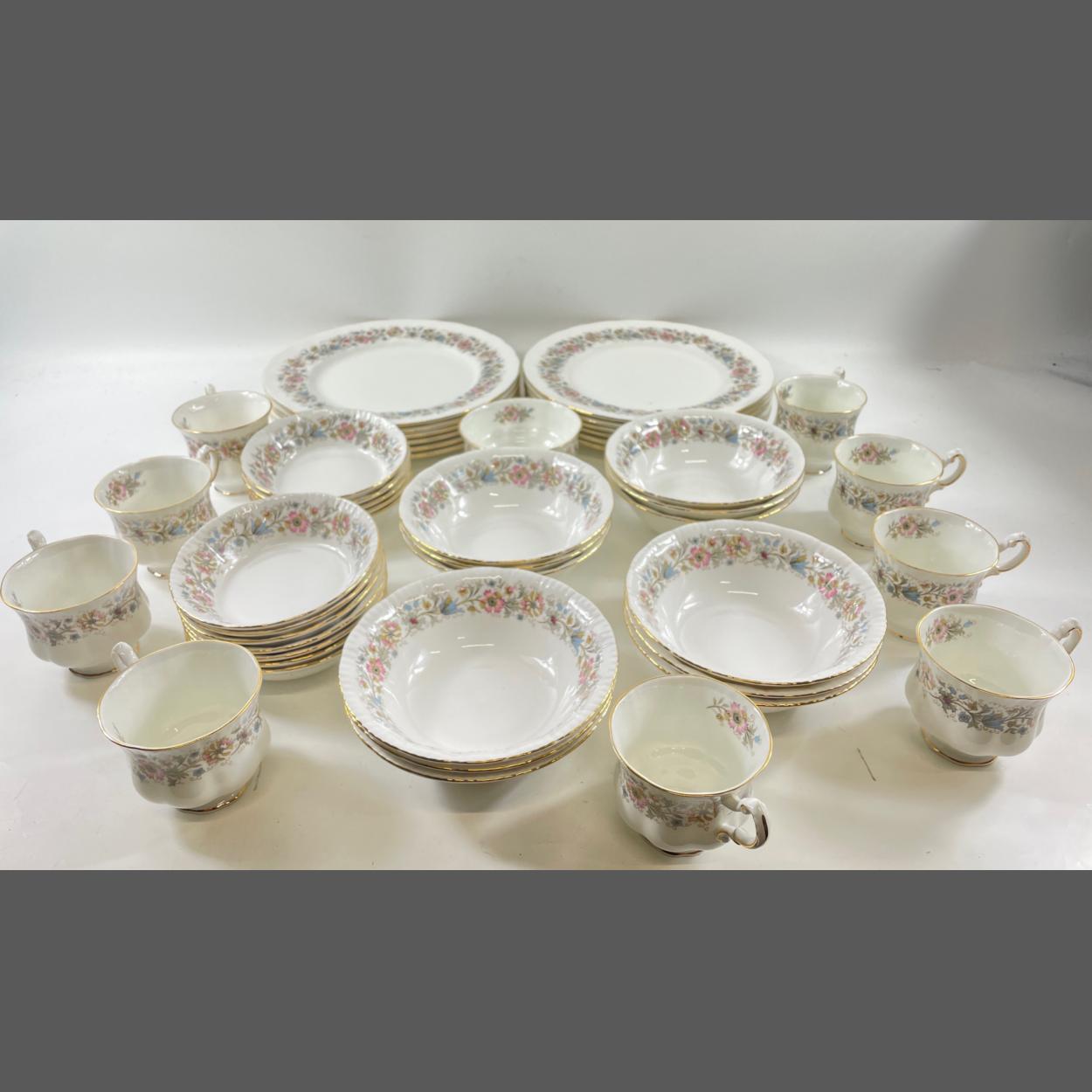 A LARGE PARAGON 'Meadowvale' pattern part tea and dinner service consisting of 9 cups (8.5cm dia), 12 bowls each 13.5cm, 12 bowls each 16.5cm, 12 plates each 27cm plus 1 sugar bowl
