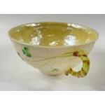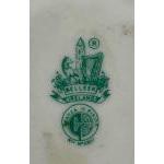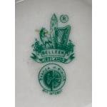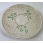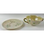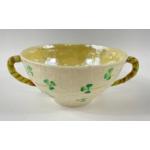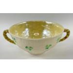 A Belleek Shamrock and Basketweave Bouillon/Soup Bowl and Saucer 5th Generation, 2nd Generation Green 1955-65. This bowl is in good condition with no chips, cracks or crazing. The measurements are as follows: 2.5"h, 6" width at greatest point, 4.5" (rim to rim) and 2" wide (across bottom). The saucer measures 6" across with a 2" space for the bowl to sit in.