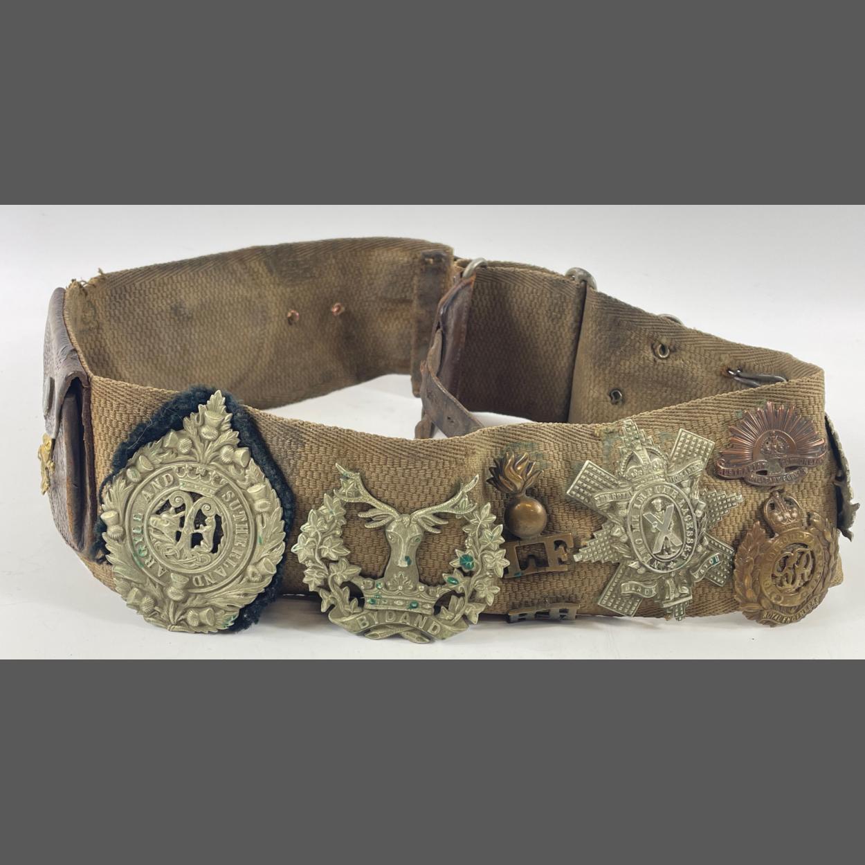 A WWl belt with 15 badges and buttons including SCOTTISH HORSE, ROYAL ARMY MEDICAL CORPS, ARGYLL AND SUTHERLAND, BLACK WATCH, ROYAL ENGINEERS, AUSTRALIAN COMMONWEALTH MILITARY FORCES, THE CAMERONIANS etc