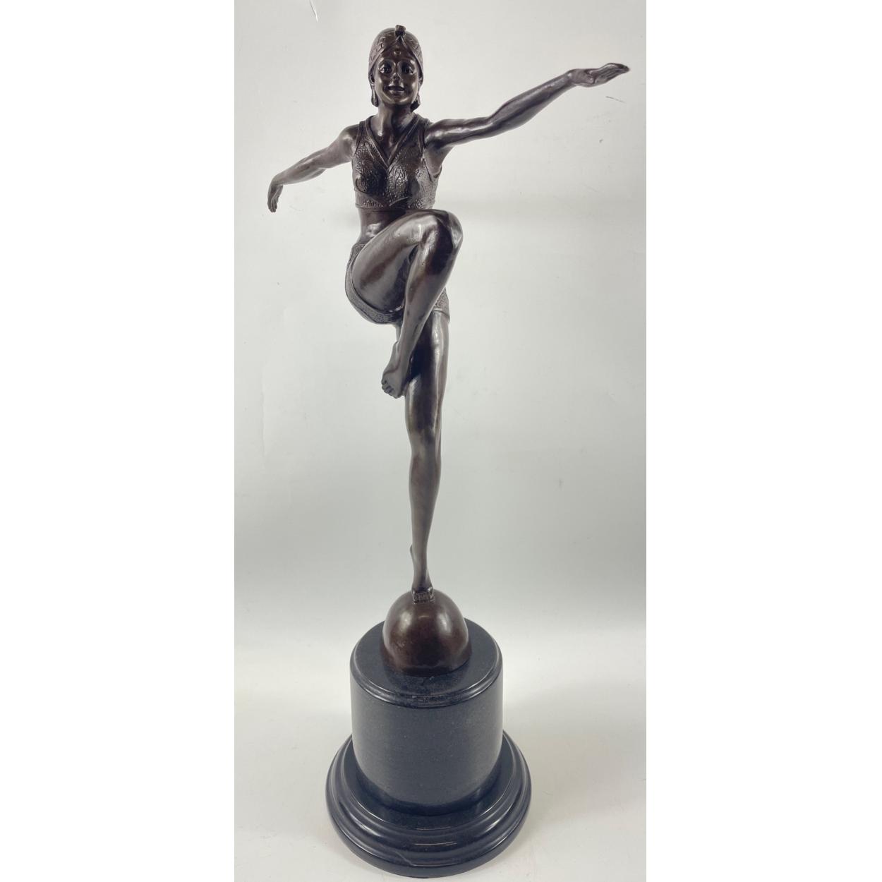 An ART DECO BRONZE in the syle of DEMETRE HARALAMB CHIPARUS, a dancing lady on a marble base, stands 56cm tall