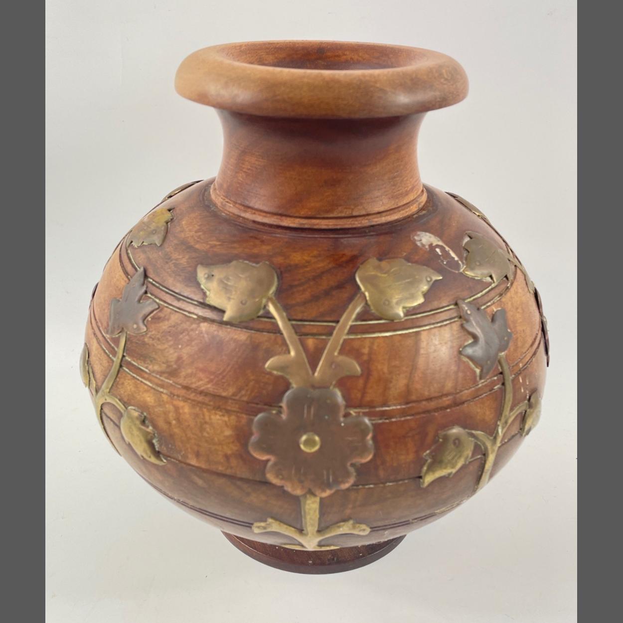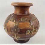 A most unusual CONTINENTAL studio-vase made from wood with bands of brass flowers, stands approx 22cm high