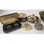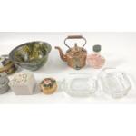 A collection of small VINTAGE pill/trinket boxes to included John Jenkins 24kt gold, wood, glass, etc and a small copper kettle