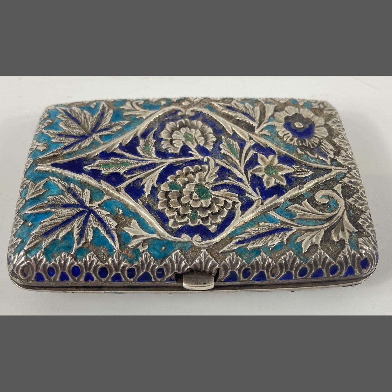 A VINTAGE Russian blue and turquoise enamelled silver coloured card case with gilt interior 8.5x5.5cm