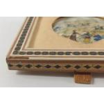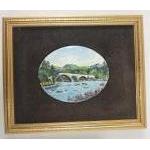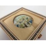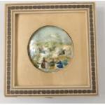 Two small pictures, one of Middle Eastern dancing on mother of pearl (11x11cm), the other hand-painted enamel of The Old Bridge of Dee at Invercauld (14x12cm)