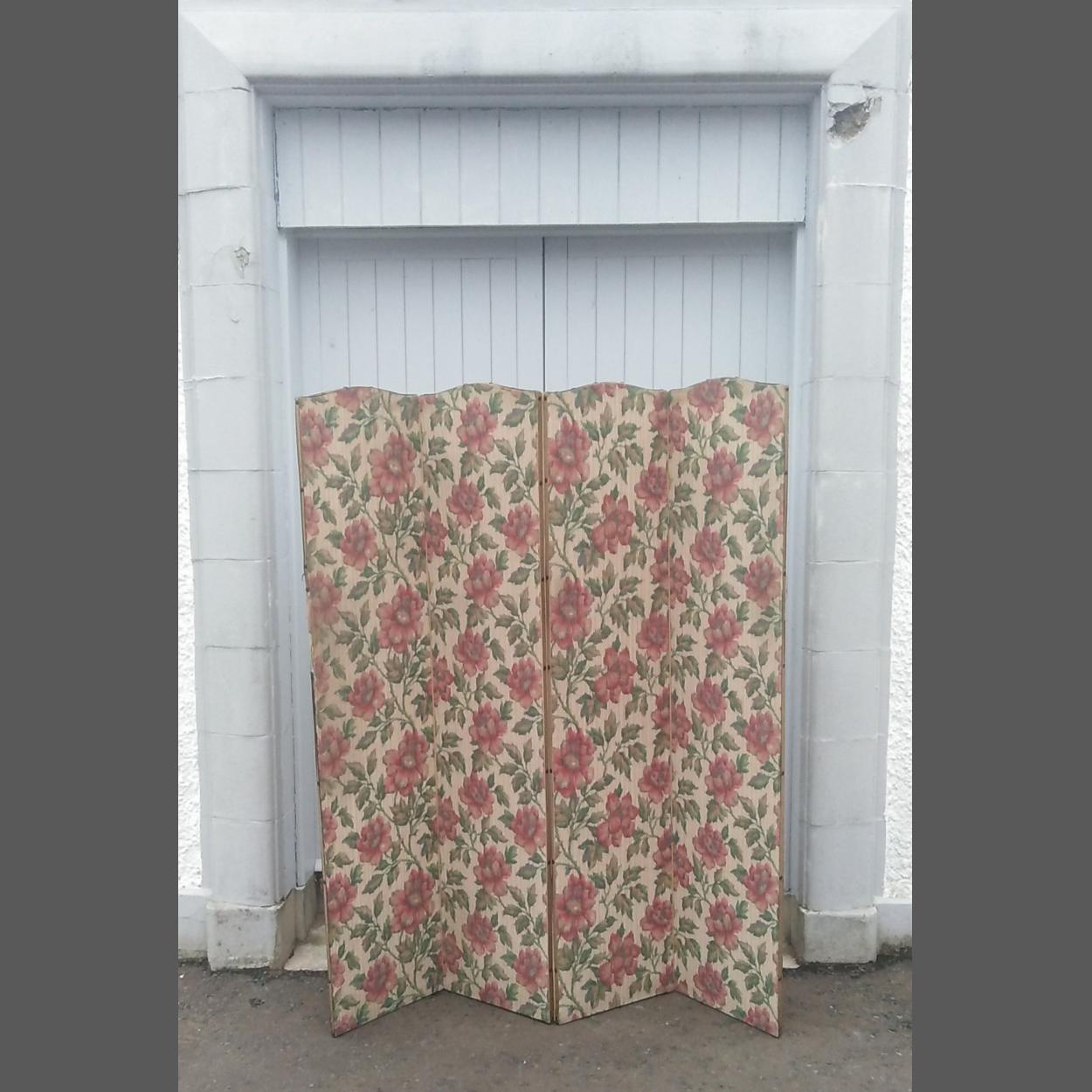 VINTAGE Four panel fabric folding screen decorated with red flowers. Some fraying to fabric and 1 panel has rip in fabric