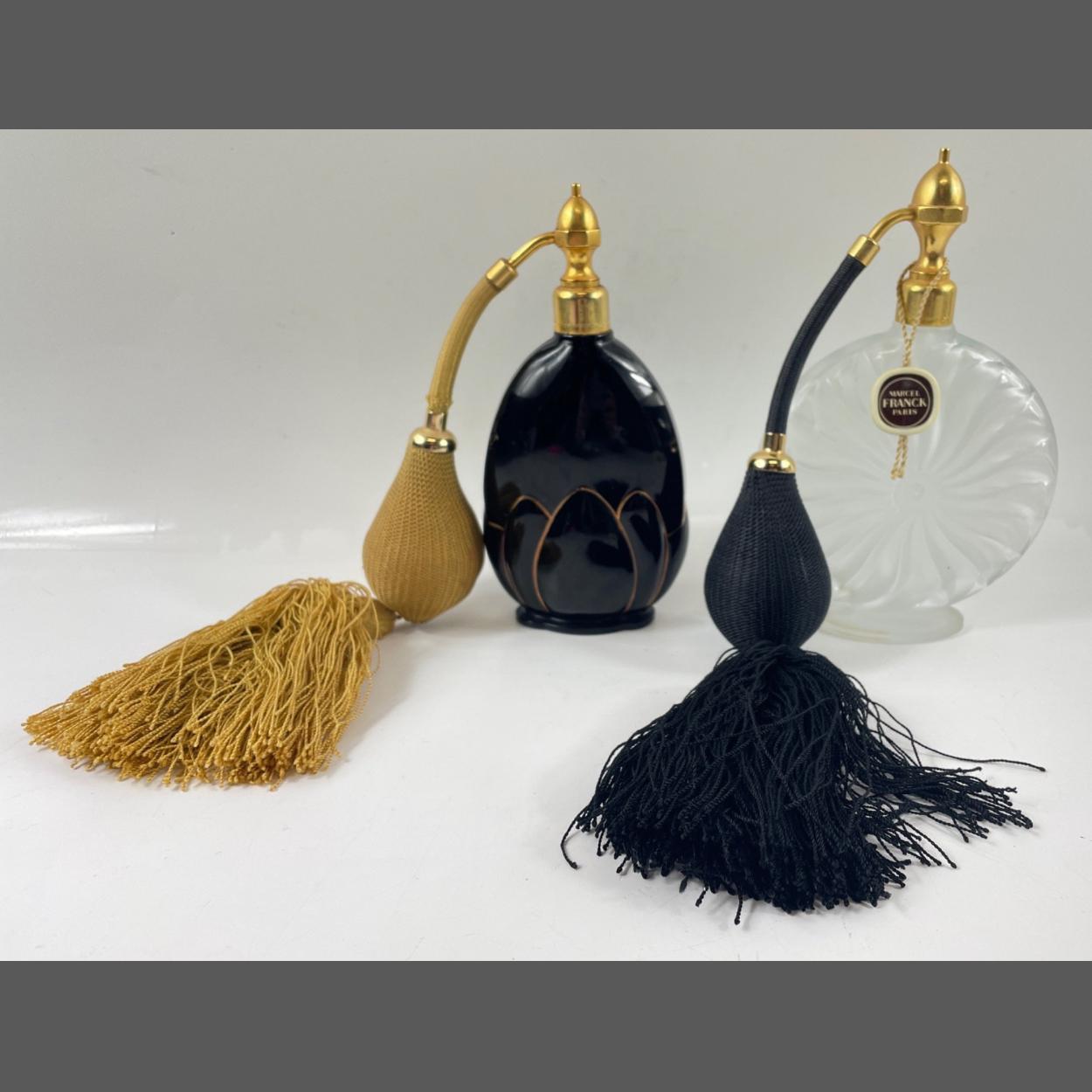 Attractive MARCEL FRANCK of Paris perfume bottles with atomiser, each 17cm high, with " Marcel Franck /// Made in France +Brevete+S.G.D.G." incised around neck