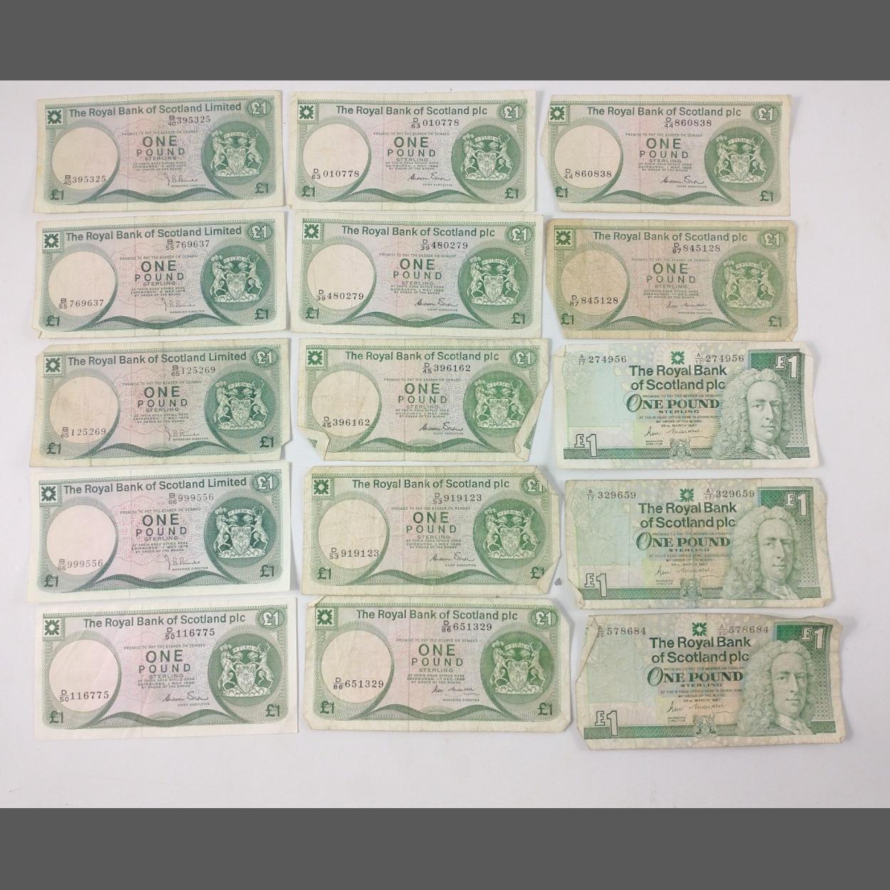 Collection of Scottish paper banknotes to include 2x £1 Royal Bank of Scotland Limited dated 1978, 2x £1 Royal Bank of Scotland Limited dated 1979, 8x £1 Royal Bank of Scotland plc notes dated 1986 and 3x £1 Royal Bank of Scotland notes dated 1987