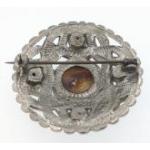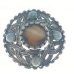 White metal Celtic knot circular brooch set with various agate stones. In a Heathergems presentation box. Central stone measures 19mmx19mm approx