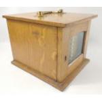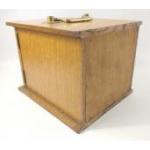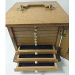 An EDWARDIAN APPRENTICE PIECE coin collection 10 blue velvet-lined drawer cabinet with small bone knob handles, a large brass carry handle, a glass framed door with locking mechanism, but no key (which is relatively easy to replace) - dimensions 23cm depth x 19cm x 17cm height